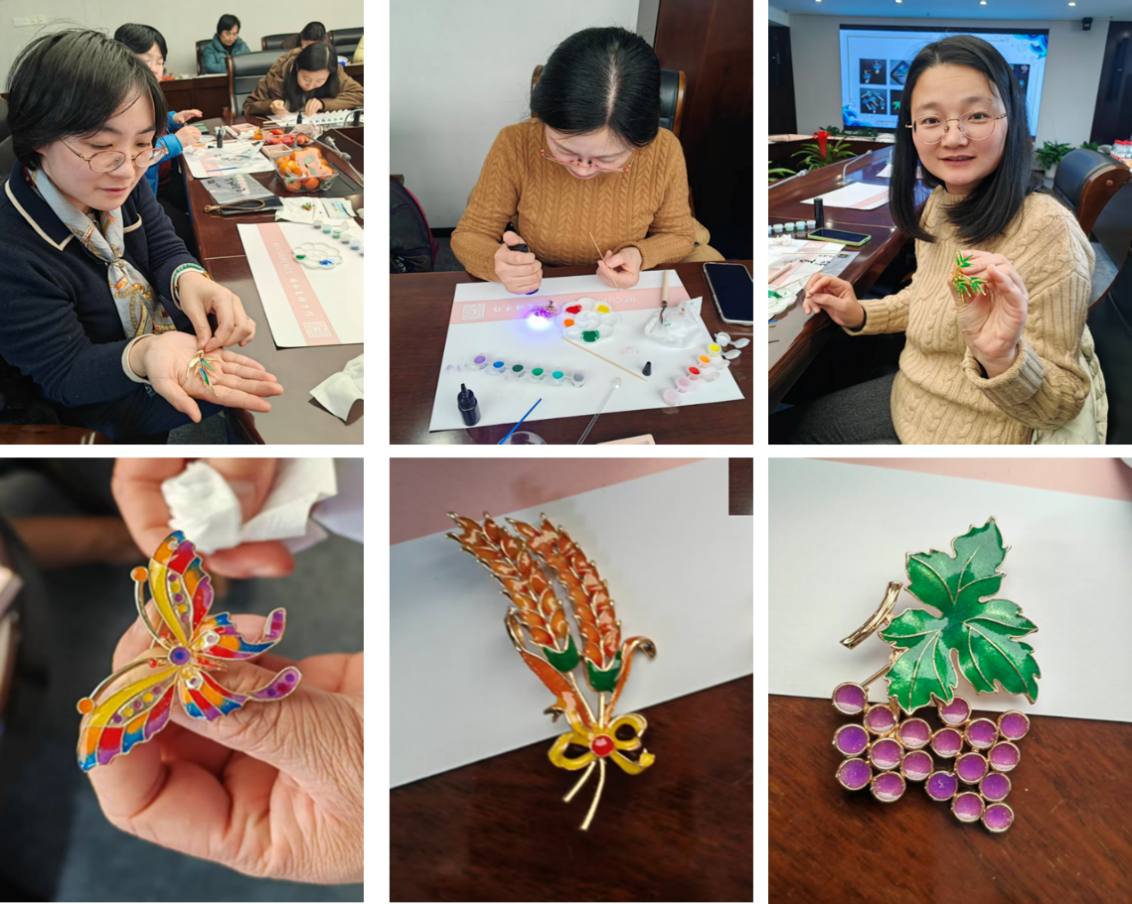 在实操环节,老师们化身“匠人”,开启了点蓝初体验。桌上摆放着铜胎胸针底胚、釉料、滴管等专业工具。在专业人员的指导下,老师们从色彩的搭配,到上色的过程以及收尾的固定过程都小心翼翼,屏气凝神。平日里在实验室里摆弄精密仪器的女教授、女博士们,此刻专注于色彩的魔法。大家相互交流,彼此欣赏雏形作品,完成的老师还时不时分享配色心得,现场氛围融洽而温馨。