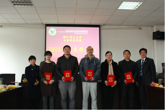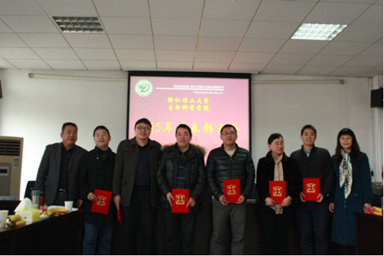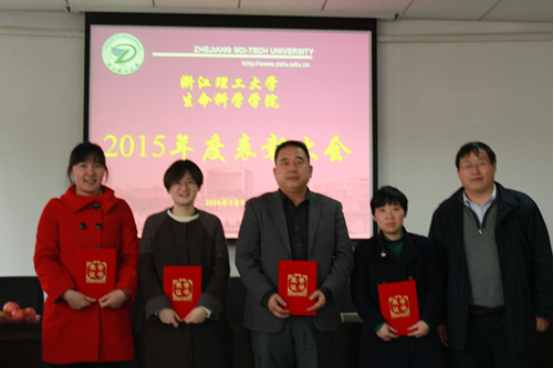 吕旻首先对学院全体教职工一年来对学院领导班子工作的支持,对学院发展改革的贡献表示感谢,随后学院党委书记、院长梁宗锁教授,学院副院长盛清教授分别宣读了《浙江理工大学生命科学学院关于表彰2015 年度各类奖项评比结果的通知》、《浙江理工大学生命科学学院获校级及以上各项荣誉》。学院领导及教授代表为受到表彰的2个先进集体、33名先进个人颁发了荣誉证书,获奖代表分别作了获奖感言。